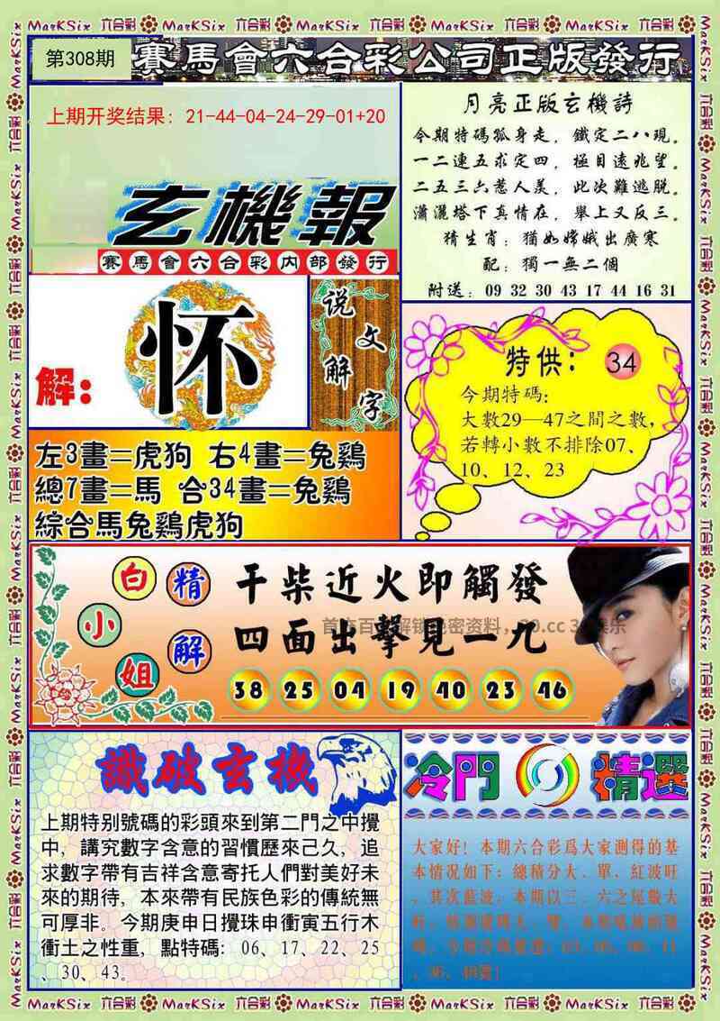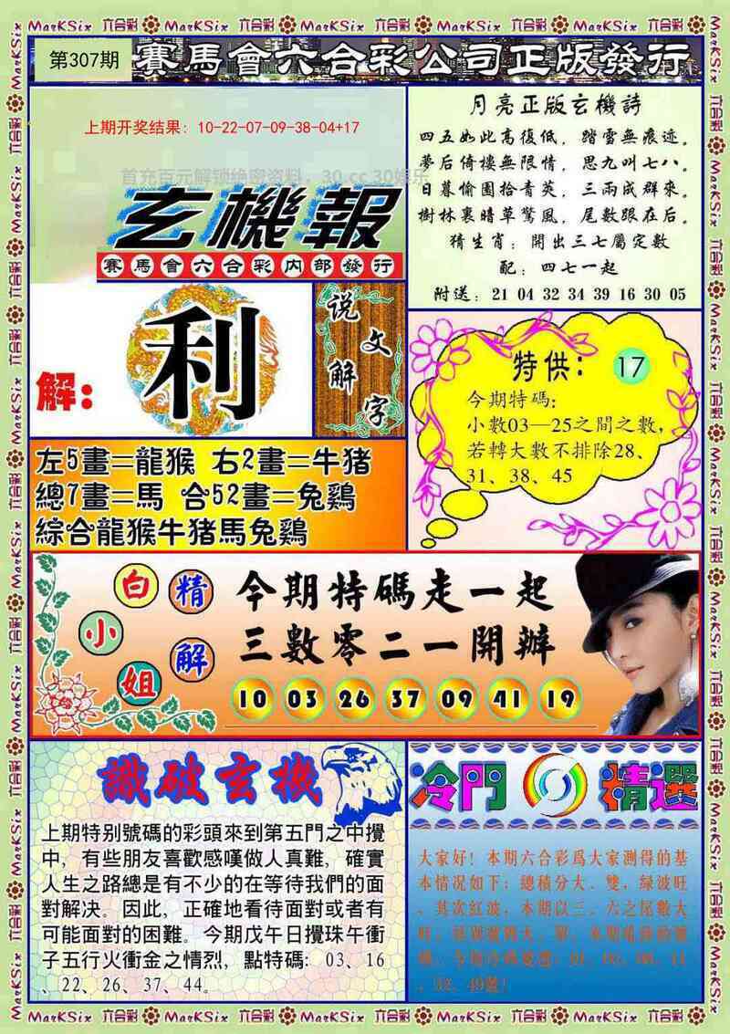 | 307期:⑨肖 | 虎猴牛龙兔蛇鸡狗羊 | 开:狗20中 |